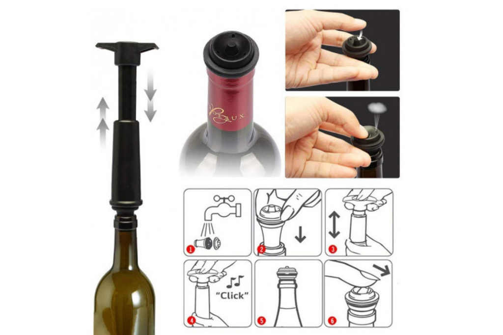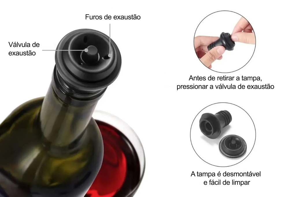 Dispositivo para evitar a oxidação do vinho + 2 rolhas. Retira o ar da garrafa, mantendo a frescura e características do vinho. Permite a conservação do vinho durante vários dias. Não deve utilizar com espumantes ou vinhos gaseficados. Com duas rolhas incluídas, compativeis com a maioria das garrafas comuns.